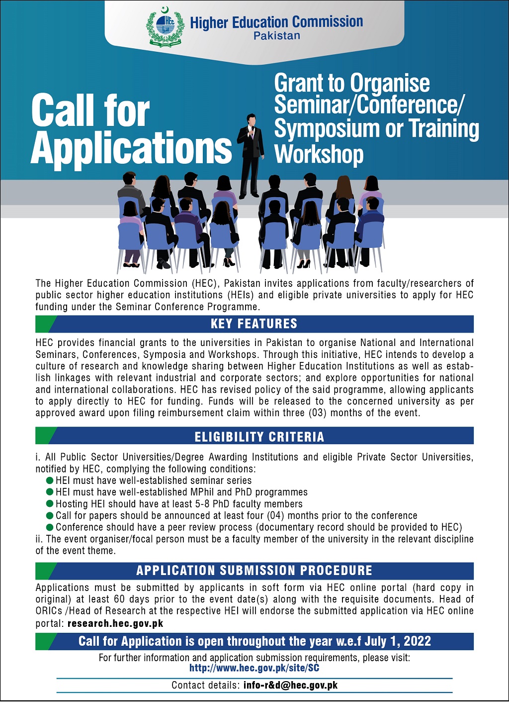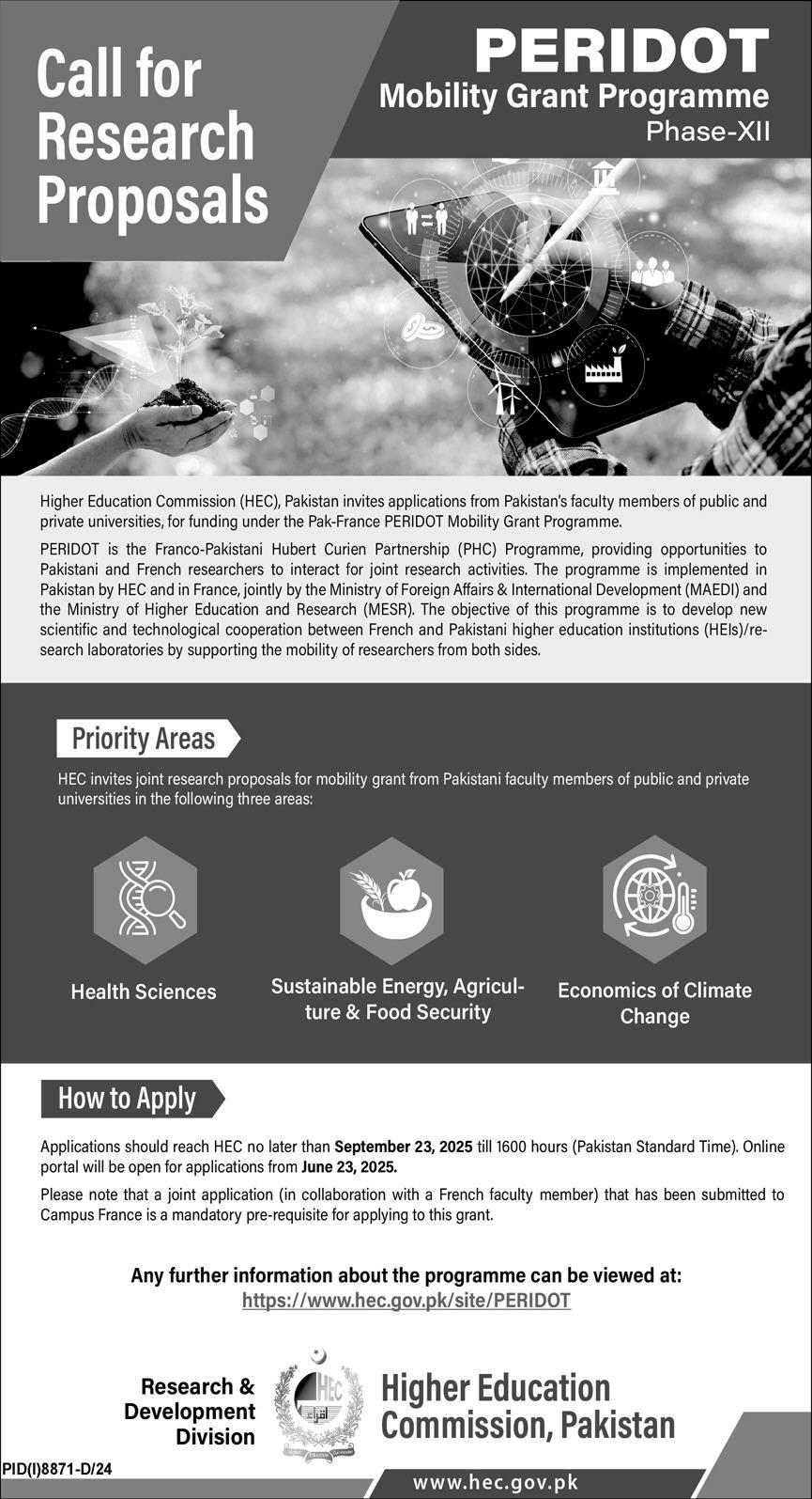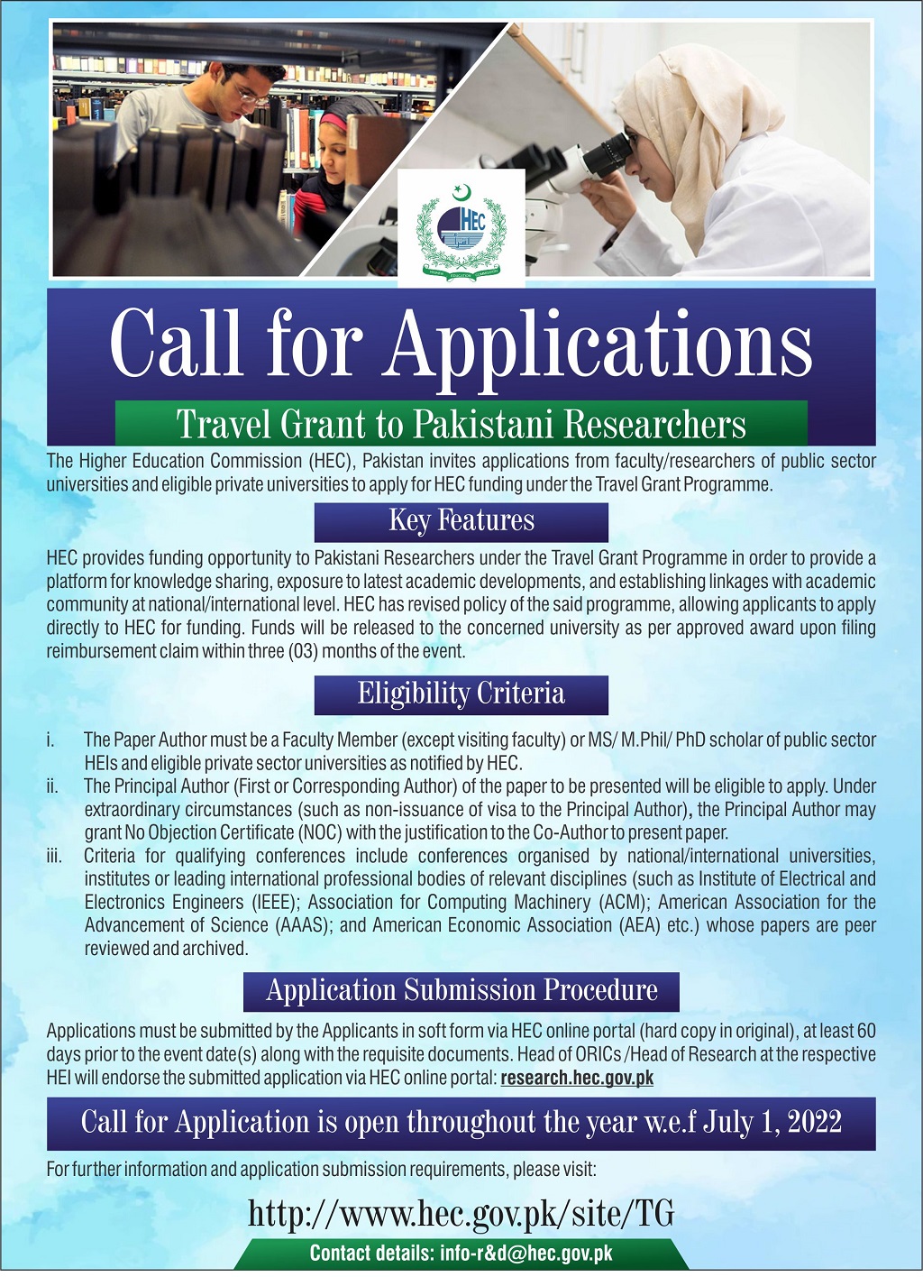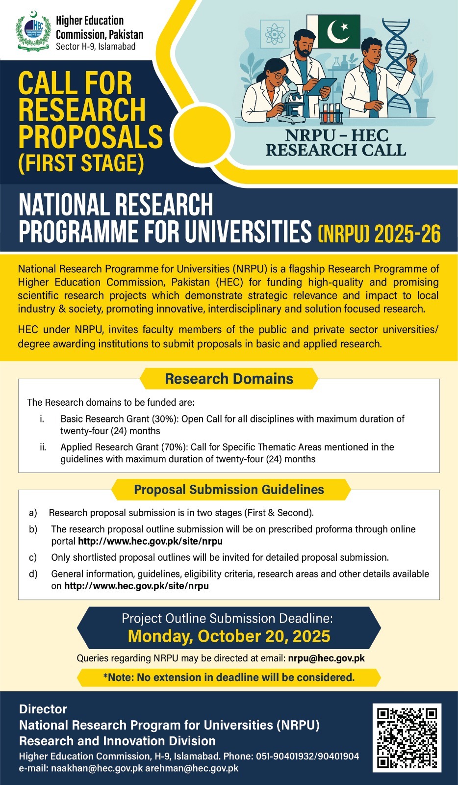 Available Research Fundings Available Research Fundings National Research Programme for Universities (NRPU) (Deadline: 20 October 2025) Travel Grants for Presentation of Research Papers Grants for Organizing Seminars/Conferences Pak-FRANCE Peridot Research Program