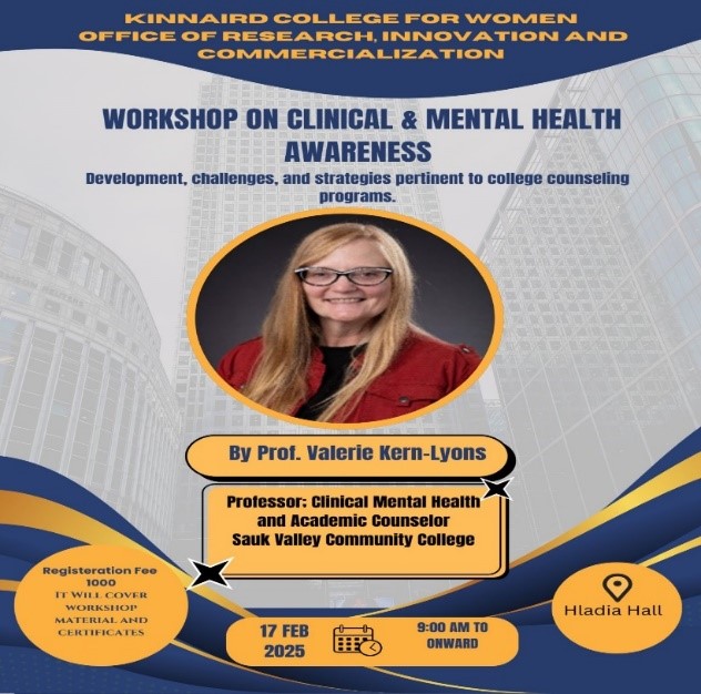 Kinnaird College for Women- Business Incubation Center (KBIC) organized a workshop on “Clinical and Mental Health awareness”. The resource person for the workshop is Prof Valerie Kern-Lyons. She enlightened the students about the importance of mental health as mental health is a state of mental well-being that enables people to cope with the stresses of life, realize their abilities, learn well and work well, and contribute to their community. Also an awareness of mental health allows us to preserve our wellbeing, address potential problems, notice warning signs as they emerge, and help others to do the same