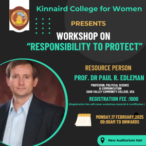 Kinnaird Business incubation Centre/ORIC Seminar on “Responsibility to Protect” Professor Dr. Paul R.Edleman, Saulk Valley Community College, He explained the term “Responsibility to protect”, seeks to ensure that the international community never again fails to act in the face of genocide, ethnic cleansing, war crimes and crimes against humanity.