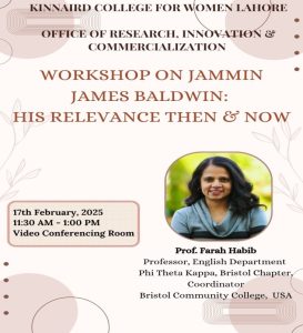Kinnaird College for Women- Office of Research Innovation and Commercialization (ORIC) organized a workshop on Jammin James Baldwin: His Relevance Then and Now, held on Monday 17th Feb, 2025. The guest speaker Professor Farah Habib from Bristol community College, USA enlightened the students with her thoughts, in an era where voices of change and resistance are more vital than ever, the legacy of James Baldwin continues to resonate through the corridors of time, inspiring a new generation of writers and activists. Baldwin’s work, characterized by its profound insight into race, sexuality, and human rights, remains a beacon for those navigating the complexities of modern society. This post explores the enduring impact of Baldwin’s legacy on contemporary literature and social discourse.