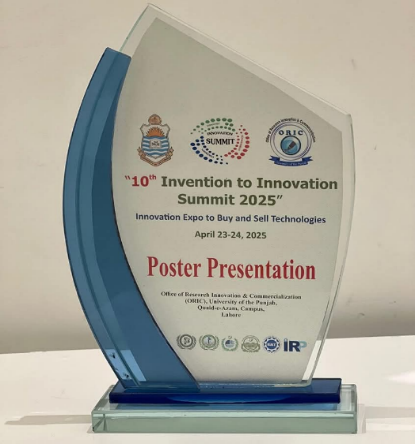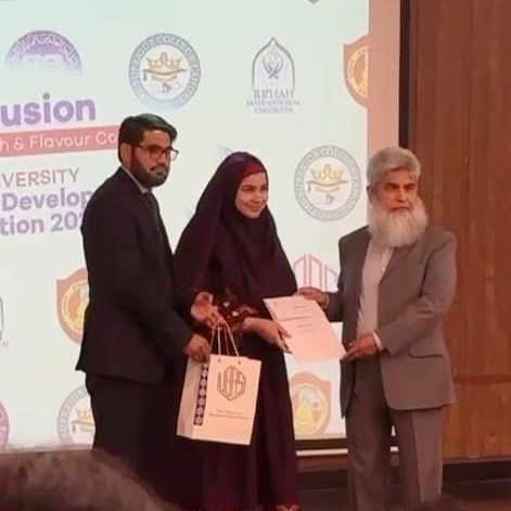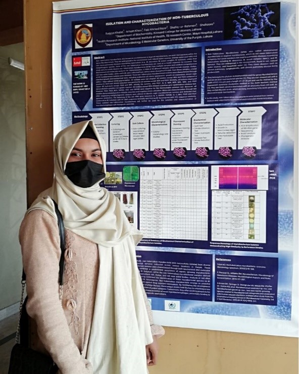 Ms. Shahzara (Student of M.Phil Biochemistry) under the supervision of Dr. Ruqyya Khalid presented a poster entitled “Isolation and characterization of Non-tuberculosis mycobacteria” and secured 1st Position and Cash Prize at a National conference “Recent Advances in Biological Sciences” (RABS 2025) on January 21-22, 2025 organized by the Department of Biology, Lahore Garrison University.