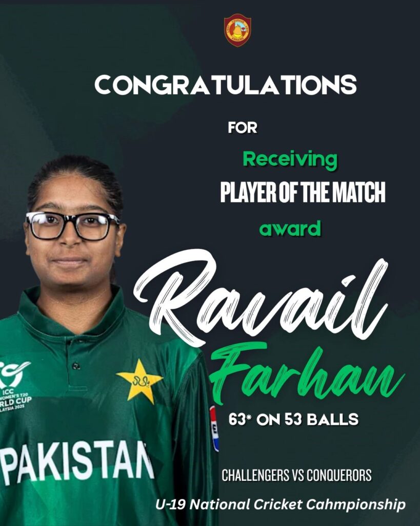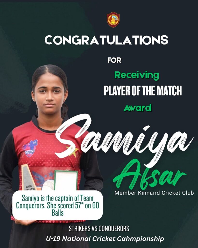 Kinnaird College for Women is proud to celebrate the outstanding achievement of its talented student, Samiya Afsar, who has brought great honor to the institution through her remarkable performance in the U-19 National Championship. Representing her team, the Conquerors, Samiya not only led as team captain but also delivered an exceptional batting performance that earned her the prestigious Player of the Match award. Displaying remarkable composure, technical skill, and strategic leadership on the field, Samiya’s performance was a testament to her dedication, discipline, and passion for the sport. Her innings played a pivotal role in securing a crucial victory for her team, showcasing her ability to perform under pressure and lead by example.