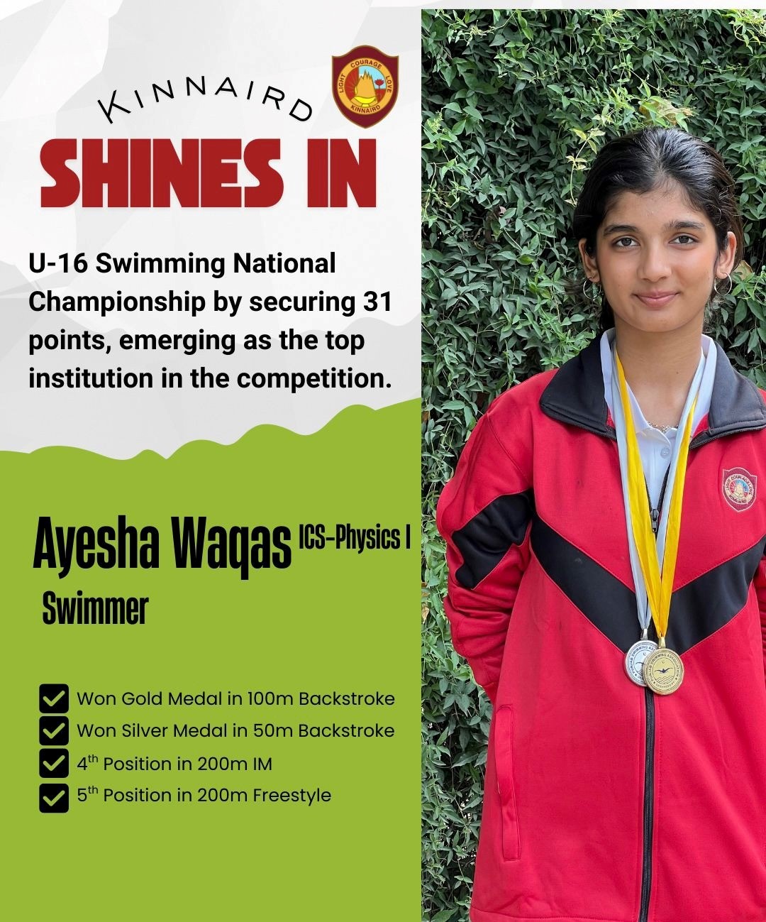 Another proud moment for Kinnaird College as Ayesha Waqas, a student of ICS Physics, brought immense honor by winning 1 Gold Medal and 1 Silver Medal at the recently concluded U-16 National Swimming Championship. Her outstanding performance not only showcases her talent and dedication but also played a crucial role in securing Kinnaird’s Number 1 ranking in this prestigious national event. Ayesha’s achievement reflects the college’s commitment to excellence in both academics and sports, and she continues to inspire her peers with her determination and hard work.