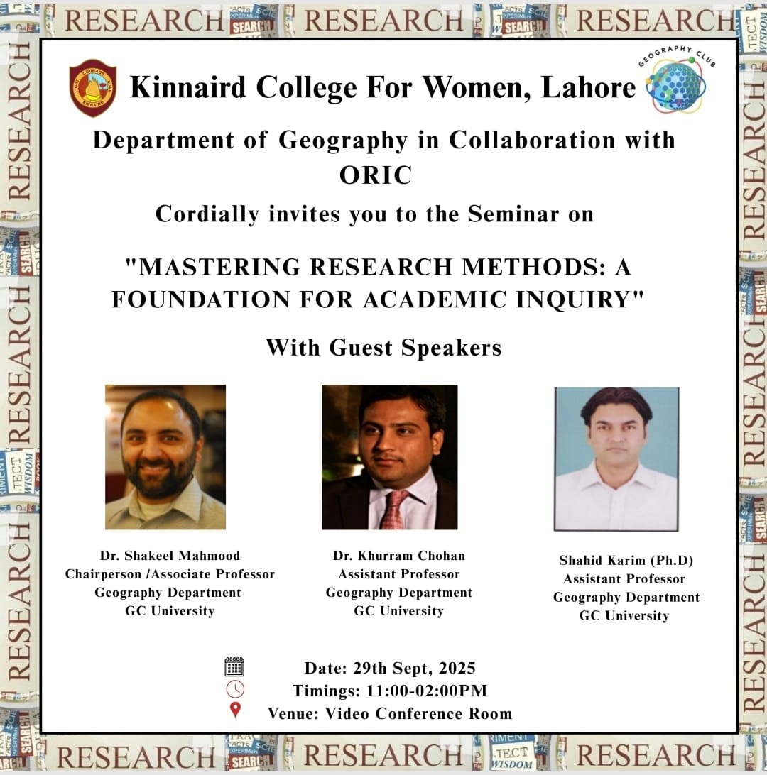 The Geography Department of Kinnaird College for Women organized a highly informative seminar today titled “Mastering Research in Geography.” The session aimed to equip students with essential research skills, methodologies, and tools specific to the field of geography. Experts and faculty members shared valuable insights on formulating research questions, data collection techniques, and the use of GIS and spatial analysis in academic research. The seminar provided a platform for students to enhance their understanding of the research process and encouraged them to pursue innovative and impactful studies within the discipline.